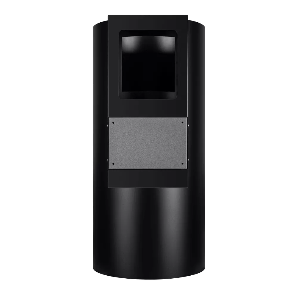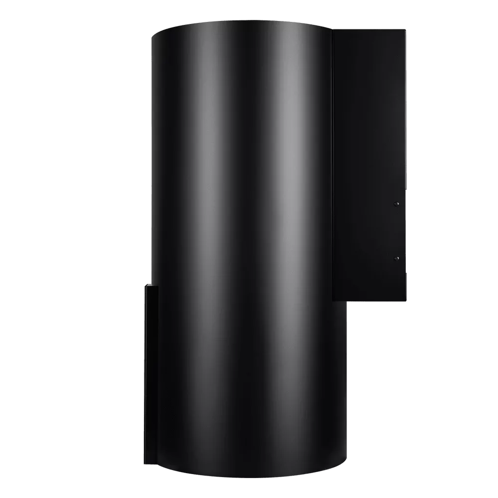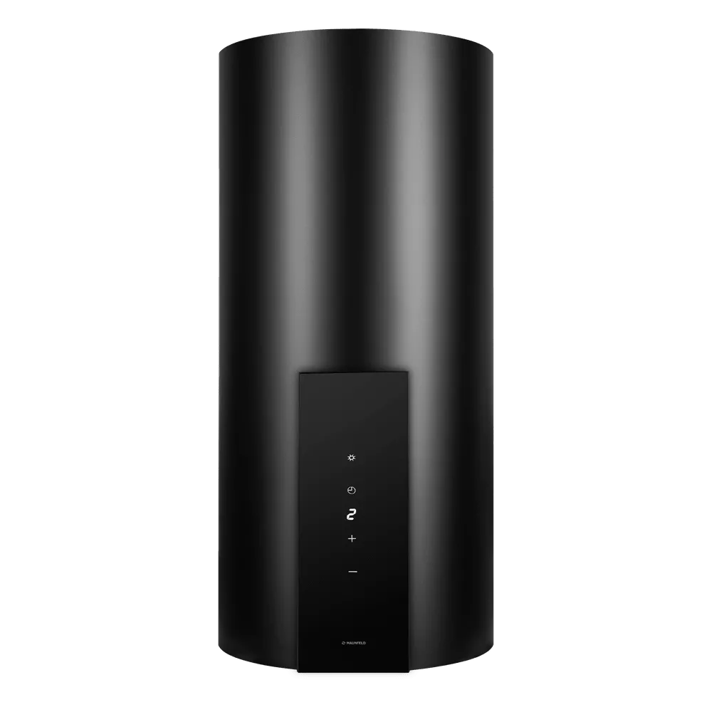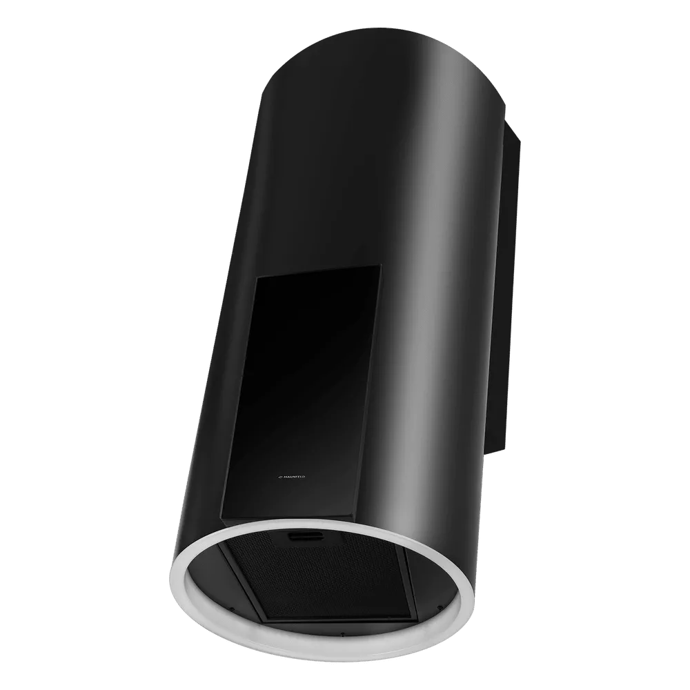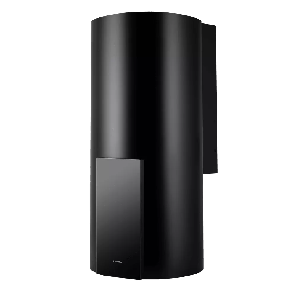 Корпус цилиндрической формы, выполненный из нержавеющей стали с термостойким покрытием, устанавливается на стену над поверхностью плиты. Алюминиевый многослойный жироулавливающий фильтр находится в нижнем торце вытяжки.