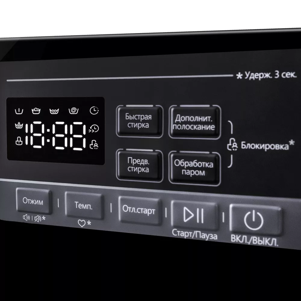 Для освежения вещей и деликатного ухода предусмотрен режим «Обработка паром». Пар глубоко проникает в волокна, помогает разгладить складки, уменьшить запахи и справиться с аллергенами. В наборе программ — «Экспресс 15’», «Шерсть», «Детская одежда», ECO 40-60, «Спорт» и другие решения на каждый день.