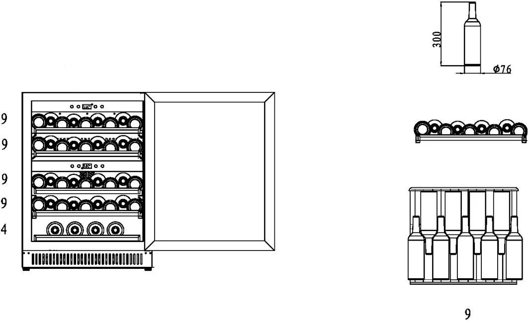 Пять съемных полок из дерева предназначены для правильного хранения вина: бутылки кладутся горизонтально (вместительность – 40 бутылок). Деревянные полки оборудованы фиксаторами от самопроизвольного выдвижения и компенсируют механические воздействия компрессора и вентилятора. Параметры холодильника задаются вручную, а также при помощи мобильного приложения «CASO-App». Возможна удаленная смена настроек из любой точки мира. Управление осуществляется при помощи двух сенсорных панелей.  Регулировка температурных показателей с шагом в 1°C происходит нажатием « ∧ » и «∨». Управление внутренним освещением возможно при помощи кнопки «Свет». Встроенные светодиоды не нагреваются, и внутренний микроклимат остается максимально благоприятным для хранения бутылок.