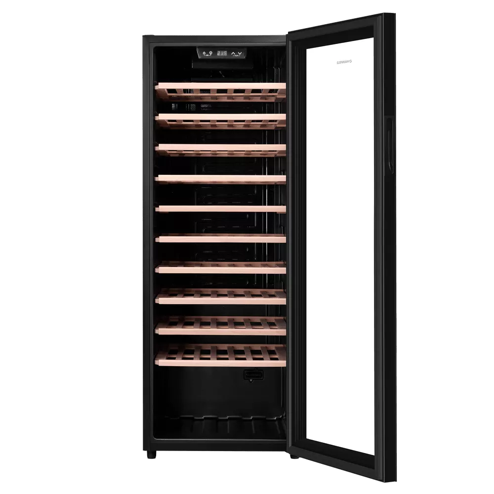 Дверца из тонированного стекла с защитой от УФ-излучения сохраняет напитки, а компрессорное охлаждение стабильно поддерживает условия хранения при влажности 50–80 %.