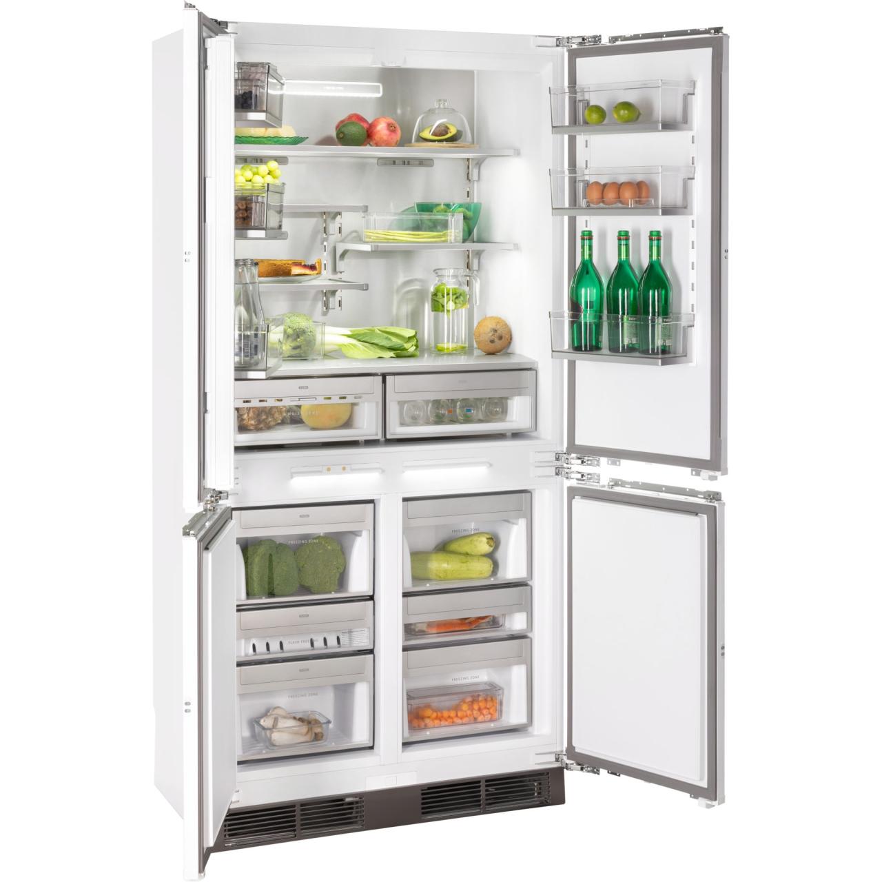 Продуманная внутренняя эргономика холодильника делает хранение продуктов максимально удобным. Все ящики модели оснащены направляющими и доводчиками, открываются легким нажатием, в дверях холодильной и морозильной камер также предусмотрены доводчики. Полки холодильного и морозильного отделений имеют LED-подсветку, что обеспечивает отличный обзор продуктов.