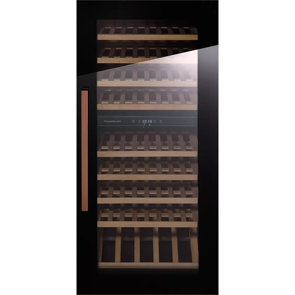 Встраиваемый винный шкаф Kuppersbusch FWK 4800.0 S7 Copper из премиальной серии K.8 — это эксклюзивное решение для хранения и созревания вин, сочетающее модный дизайн и передовые технологии. Модель выполнена в черном стекле с уникальным дизайном Copper (медные акценты), что придает ей современный и изысканный вид . Вместимость составляет 79 бутылок, размещенных на 9 деревянных полках. Электронная система управления с цифровым дисплеем и нажимными кнопками обеспечивает точный контроль температуры в диапазоне 5–18 °C в двух независимых отделениях. Инновационная система охлаждения с динамической циркуляцией воздуха гарантирует равномерное распределение температуры и влажности по всему объему. Резервуар для воды обеспечивает дополнительное увлажнение, создавая идеальные условия для длительного хранения вин. LED-освещение деликатно подсвечивает коллекцию без нагрева. Шкаф оснащен полным набором сигнализаций: звуковой сигнал, световая индикация аварии, индикация температуры внутри и снаружи. Изменяемая навеска двери (угол открывания 90°) позволяет адаптировать установку под планировку. Низкий уровень шума 39 дБ обеспечивает комфортную эксплуатацию . Производство — бренд из Германии.